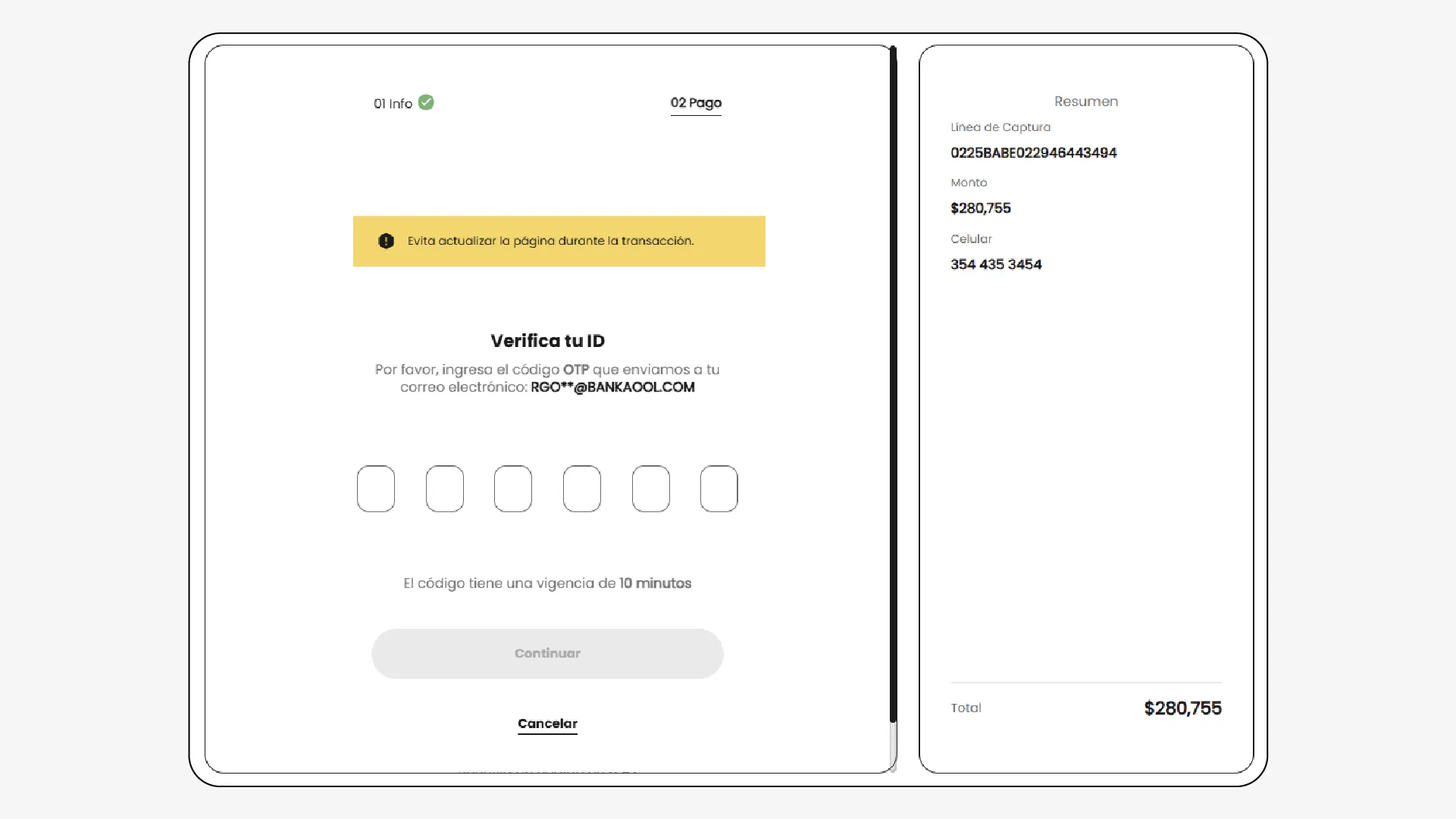 - Verifica tu ID: escribe el código OTP que te llegará a tu correo o ingresa a tu app de Bankaool ID para generarlo. Después haz clic en Continuar. Recuerda nunca compartir tu OTP con nadie.