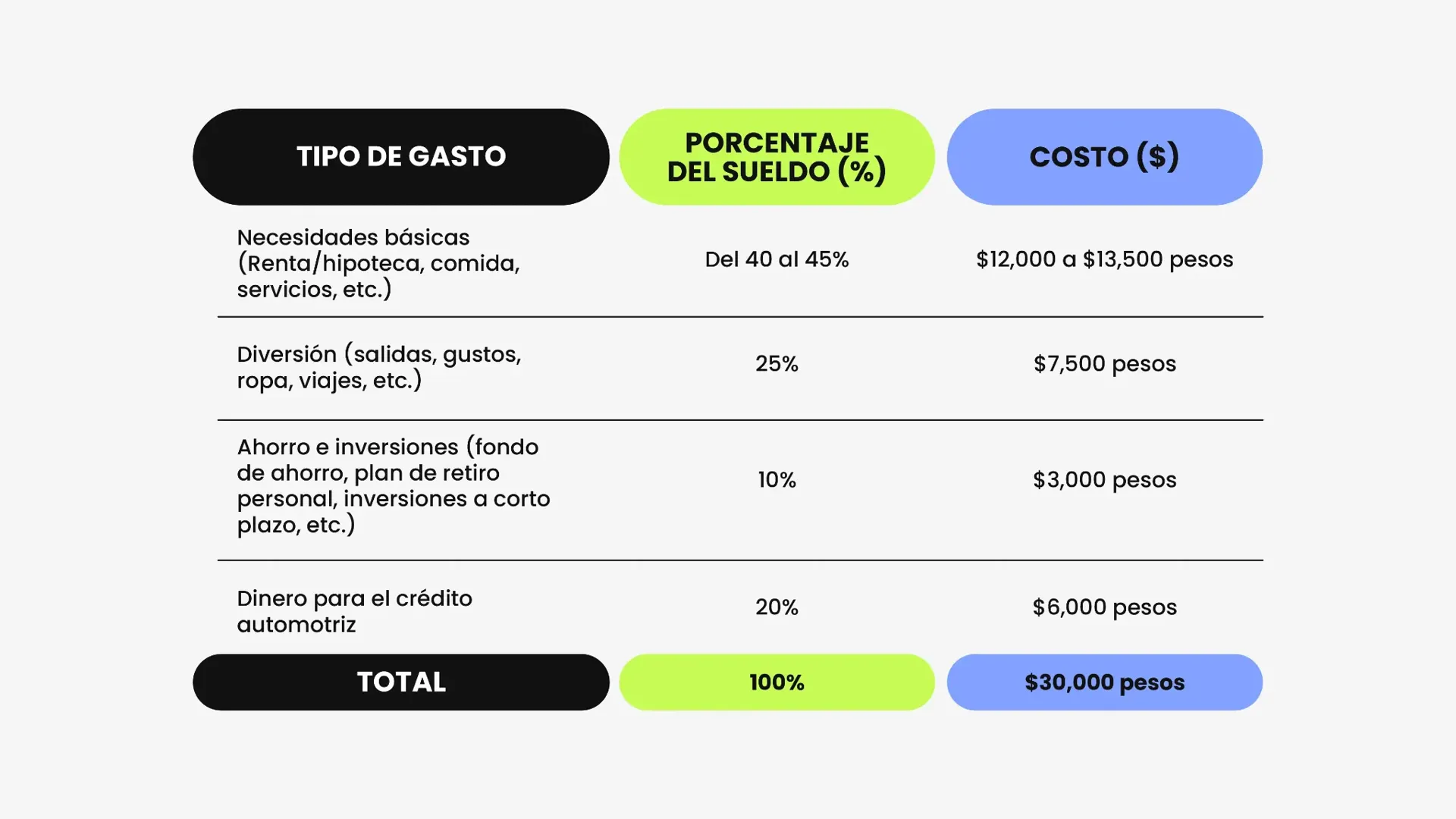 Como puedes ver en este presupuesto ficticio, podrías destinar hasta el 10% del presupuesto para tu crédito automotriz y a otros gastos del coche.
